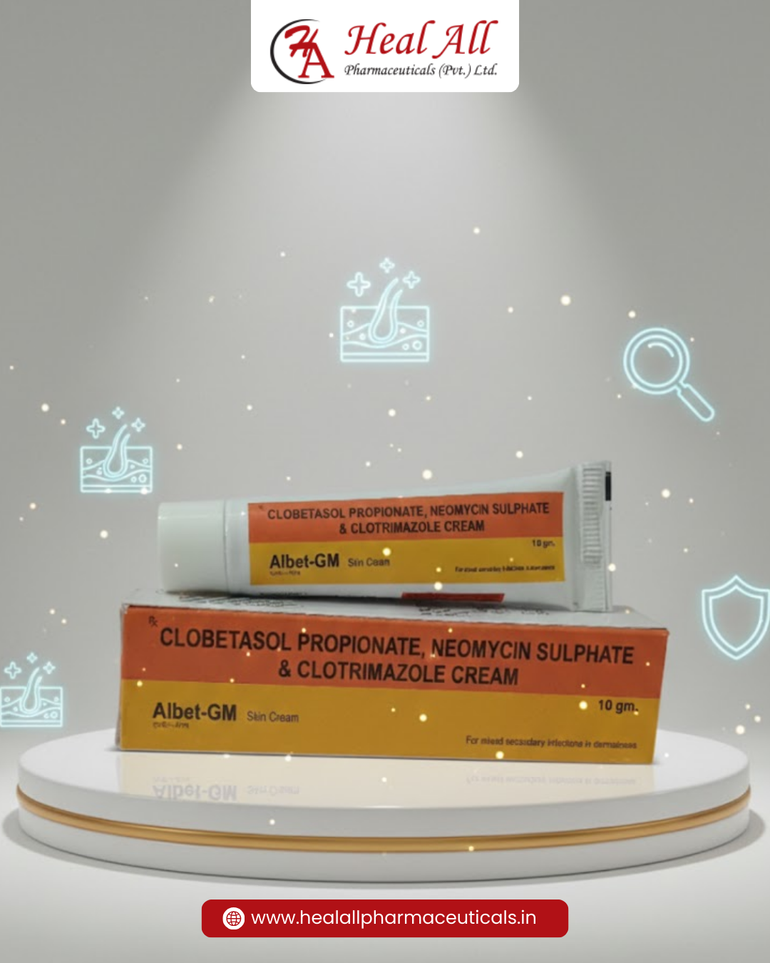 Albet-GM Cream contains Clobetasol Propionate, Neomycin Sulphate & Clotrimazole to help manage fungal and bacterial skin infections, itching, redness, and inflammation. Manufactured by Heal All Pharmaceuticals. Available in 10 gm pack.