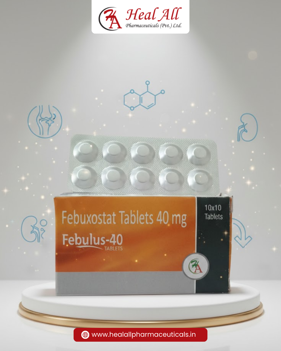 Febulus-40 Tablets contain Febuxostat 40 mg, used to help manage high uric acid levels and support treatment of gout. Helps reduce uric acid formation and supports joint health. Manufactured by Heal All Pharmaceuticals. Available in 10×10 tablets pack.