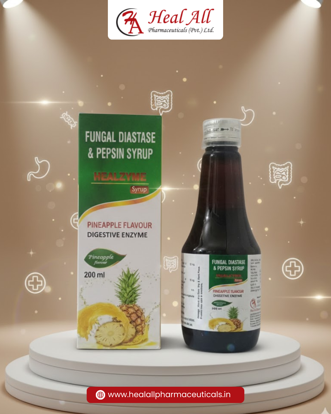 Healzyme Syrup contains Fungal Diastase & Pepsin to support healthy digestion and improve appetite. Pineapple flavoured digestive enzyme syrup that helps relieve indigestion, bloating, and stomach discomfort. Available in 200 ml packing by Heal All Pharmaceuticals.