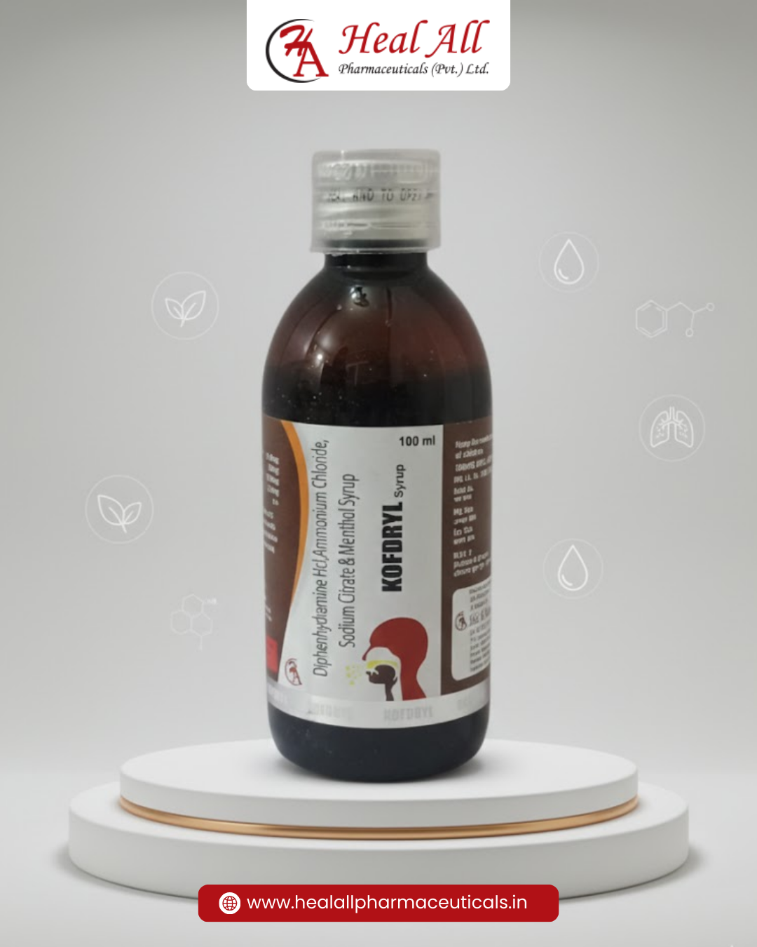 Kofdryl Syrup: is a combination formula containing Diphenhydramine, Ammonium Chloride, Sodium Citrate, and Menthol to provide fast relief from cough, chest congestion, sore throat, and nasal irritation. It helps loosen mucus, reduces allergy symptoms, and soothes the respiratory tract for comfortable breathing.