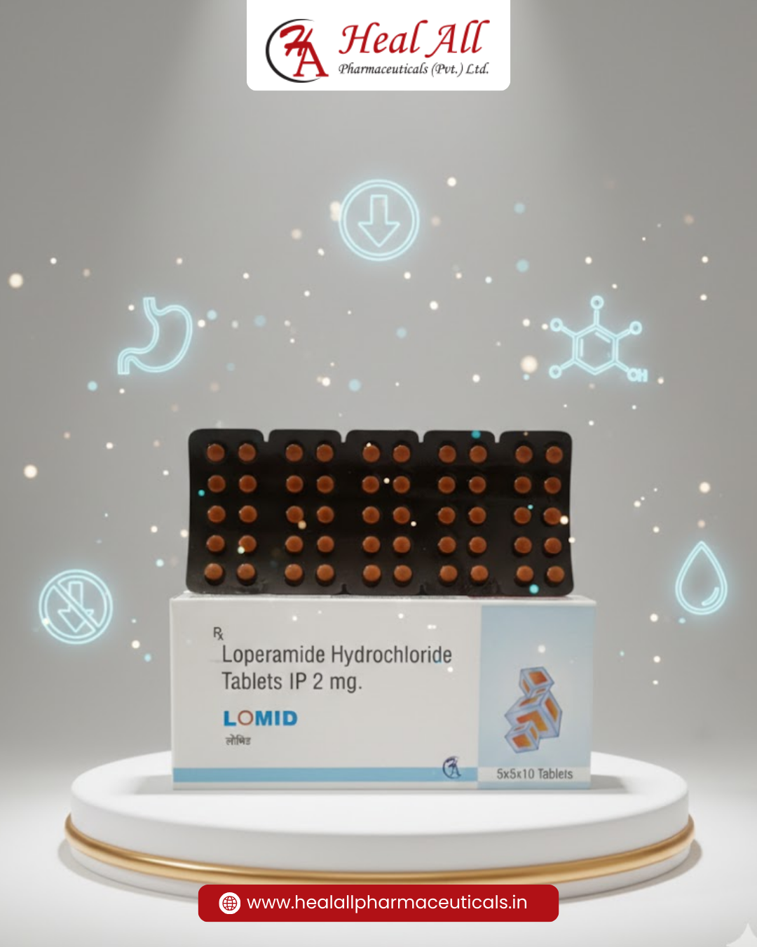 Lomid Tablets contain Loperamide Hydrochloride 2 mg used to help control diarrhea by slowing intestinal movement and improving stool consistency. Helps manage acute diarrhea and digestive discomfort. Manufactured by Heal All Pharmaceuticals. Available in 5×5×10 tablets pack.