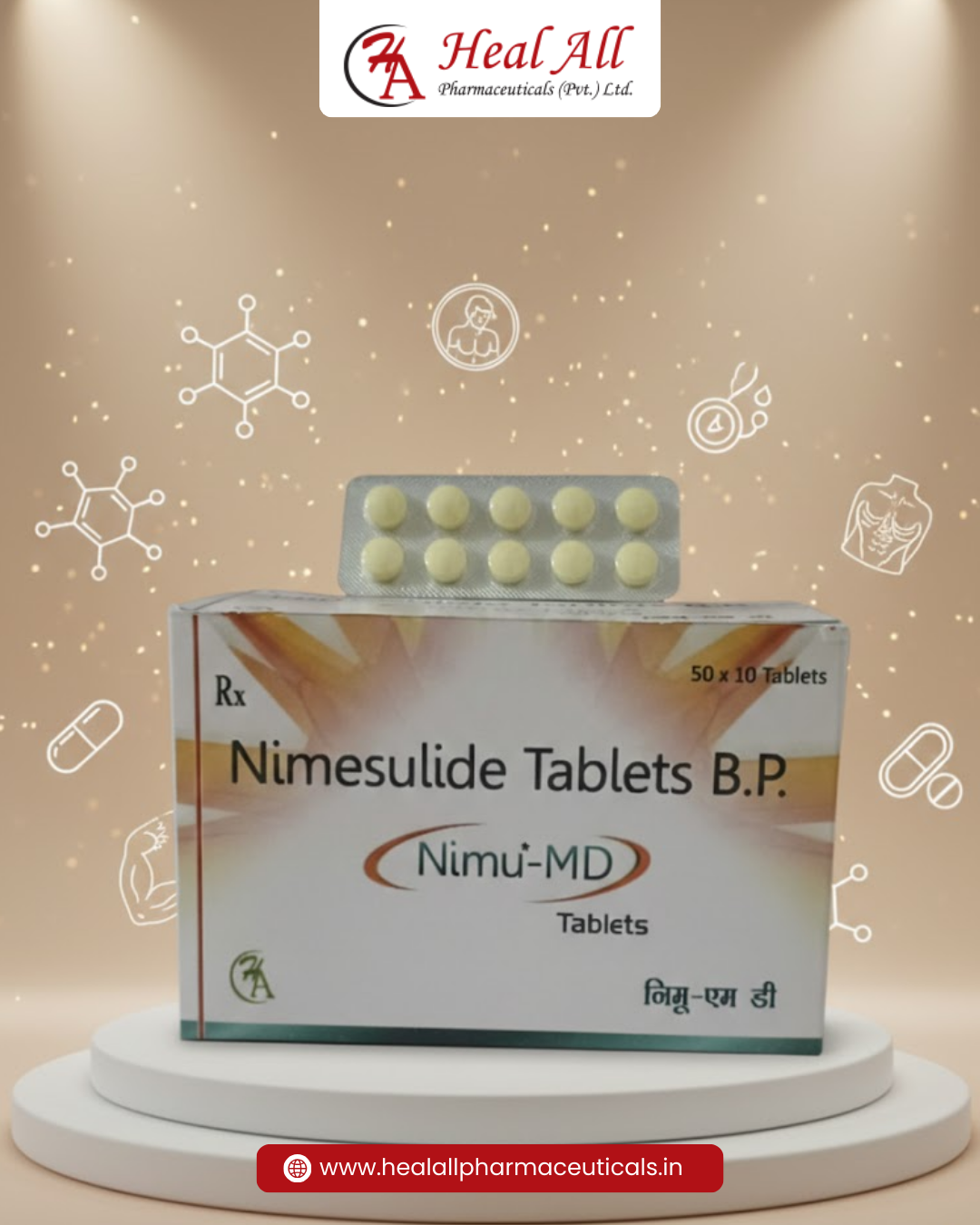 Nimu-MD Tablets contain Nimesulide B.P., an anti-inflammatory and analgesic medicine used to help relieve pain, inflammation, and fever. Commonly prescribed for musculoskeletal pain and joint discomfort. Manufactured by Heal All Pharmaceuticals. Available in 50×10 tablets packing.